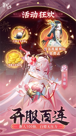上线免费十连抽,累计100000元宝免费拿,第一天就送VIP,7天送稀有红色神仙,月卡13倍返还,装备无损继承,神仙培养资源100%返还