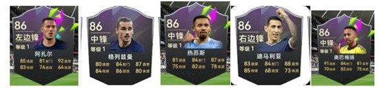 那前锋的话,射门这项都普遍较高,如果你想要数值都比较均衡的话,可以选阿扎尔、迪玛利亚;如果想打双中锋,可以选奥巴梅杨(美羊羊)、格子、热苏斯搭配签到7天送的伊布;想打三前锋阵型可以基耶萨+阿扎尔+前面选的红卡中锋;搭配你的进攻三叉戟组合