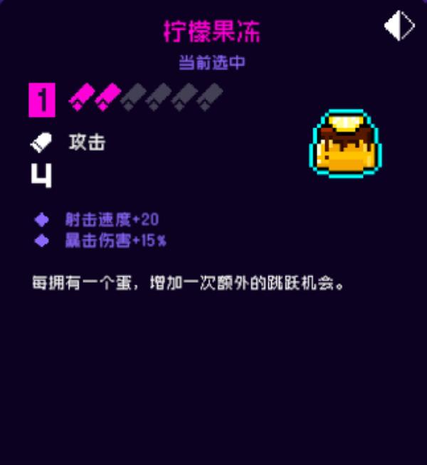 在游戏霓虹深渊无限中有各类各样的的记念品,它不只可以或许在属性上有所加成并且还具备怪异的效果,柠檬果冻是紫色质量记念品之一,得到蛋可以或许增长跳跃次数,接上去就为大家先容一下,感乐趣的小火伴快来看看吧。