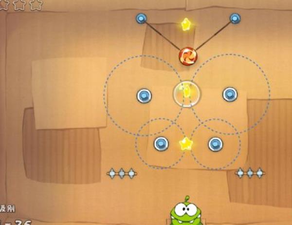 先将左下方的绳索割断吃到中心的星星,然后割断右下方的绳索吃上面的星星,然后将剩下的绳索全数割断。