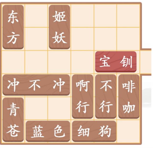 二、妖姬二字往上挪动一格,没有行二字往下挪动一格,咖啡二字往下挪动一格,宝钗二字始终往右挪动,达到出口便可通关。