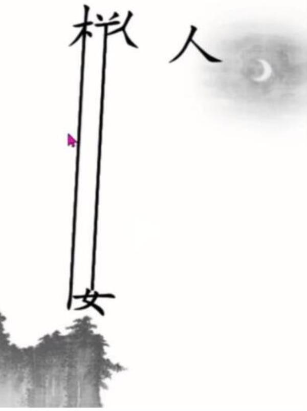 一、进入游戏后,先将木、米、女这三个字拖到山上,构成一个楼字。