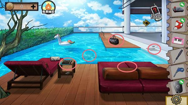 五、咱们这里先把可以拿的都拿了,实现池底小游戏后便可得到红外遥控器和半个发条,池底左侧另有螺丝刀。