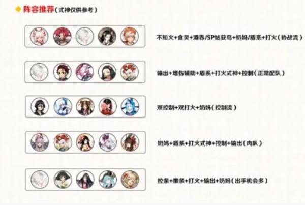 输出+增伤辅佐+盾系+打火式神+节制(一般配队)
