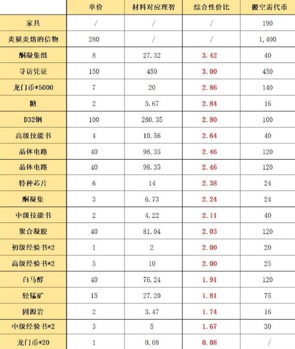 二、按照性价比排序:酮凝固组、寻访凭据、龙门币*5神仙道神仙道神仙道、D32钢、高档技术书、晶体电路、特种芯片、酮凝固、中级技术书、聚合凝胶、低级教训书*二、高档教训书*二、白马醇、轻锰矿等等。
