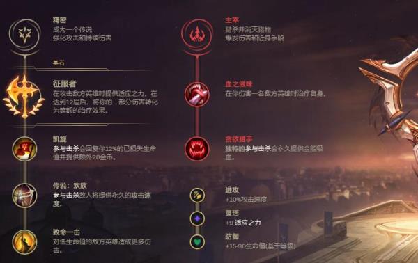 (1)主系符文:细密+征服者+凯旋+传说欢喜+致命一击;