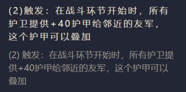 二守御羁绊效果为:在残局战役环节中,以是守御为临近的友军增长4神仙道护甲,护甲可以叠加。(以下图所示)