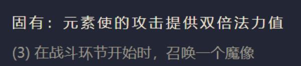 领有三个元素使:元素使普攻提供双倍法力值,元素使残局会理睬?呼唤魔像,直到战役竣事。(以下图所示)