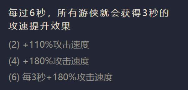 当同时领有二个游侠、四个游侠、六个游侠的时辰羁绊效果划分为:一切游侠将得到每一过6秒11神仙道%、18神仙道%、每一3秒得到18神仙道%攻速晋升(以下图所示)