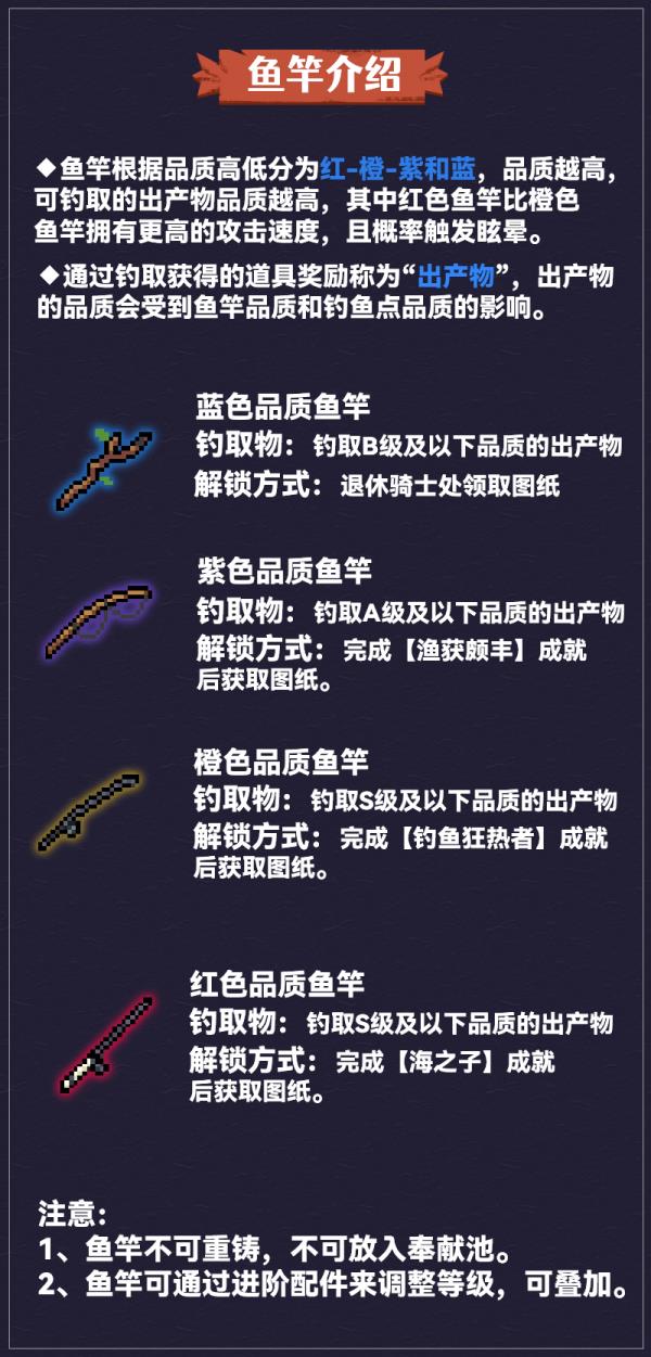 三、鱼竿有好几种质量,质量越高难度越大。