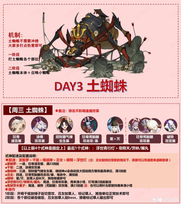 2阶段:干姬普攻boss,丑女草人放给小怪(小怪进攻更低,打进去的危险更高),用帝释天则放弓足给对应小怪便可晴明先灭后星,我方标识表记标帜草人输出便可。