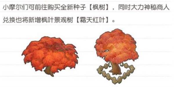 一、玩家莳植枫树以后,得到枫叶,然后可以去奥秘商人鼎力处兑换家具;