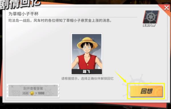 三、末了放入路飞,并点击回忆,便可获得为凉帽小子干杯图鉴。