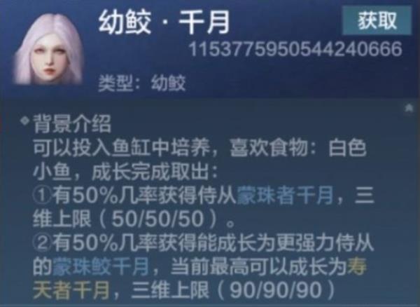 二、而第五阶段对应的鲛人质量就是归渊鲛,培育胜利有概率获取随从,最高可以发展为寿天者千月。