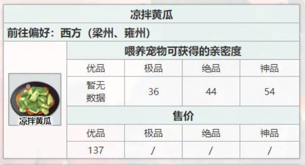 (1)凉拌黄瓜用于晋升宠物亲密度,极品、绝品、神品划分晋升:3六、4四、54
