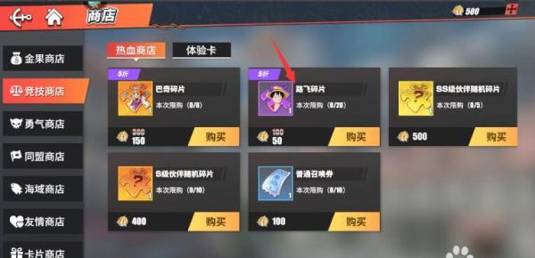 大家可以在竞技场角逐获取货泉,使用货泉便可兑换路飞碎片。